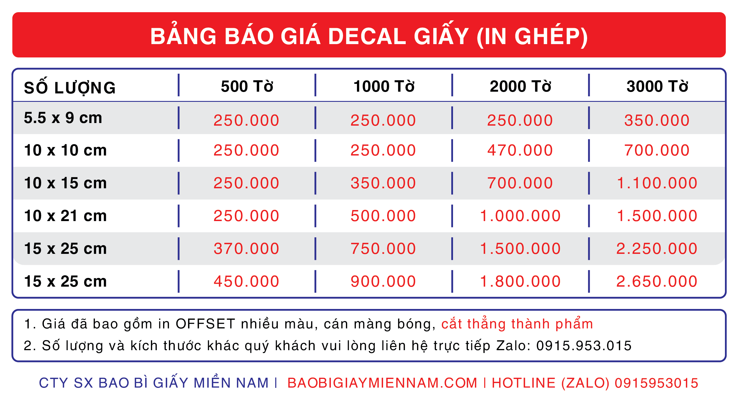 - DECAL GIẤY cấu tạo có 3 lớp : bề mặt bằng giấy dùng để in trực tiếp, lớp keo dán và cuối cùng là lớp đế dùng để bảo vệ lớp keo dán.